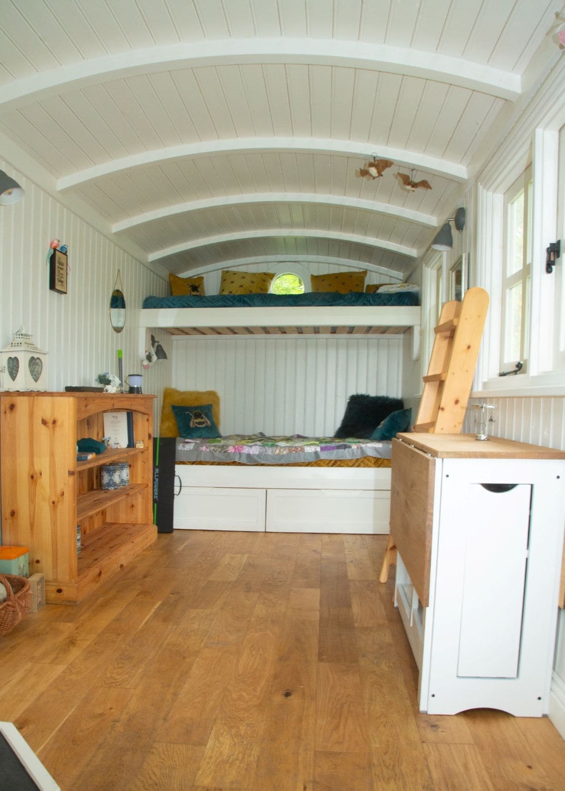 Our Shepherds hut was built as a labour of love and is set in a leafy secluded spot in our 2 acre garden. Surrounding you is blissful green complete with pond and your own personal fire pit, with our sleepy campsite nearby. The space has a delightful kitchen/living area and super comfy double bed. There is electric light and heating, and the space is stocked with kitchen essentials, bedding and household items. The new toilet and shower block is just a a short walk away.