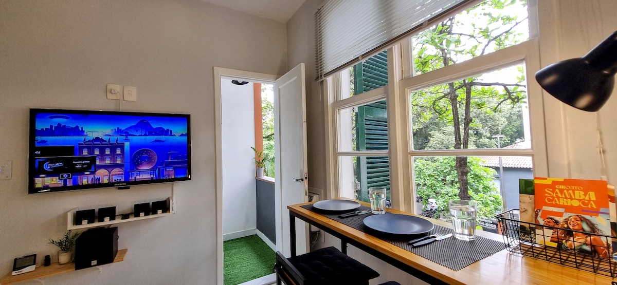 O espaço é um apartamento tipo casa, com estilo rústico, compacto mas bastante confortável e funcional. É arejado, bem iluminado, com um pátio amplo privativo, onde é possível desfrutar do sossego de uma ampla área externa, com uma vista deslumbrante que inclui o Pão de Açúcar e Cristo Redentor. O pátio é um espaço privilegiado para observar a paisagem cultural urbana do Rio de Janeiro e sua forte relação entre homem e natureza.