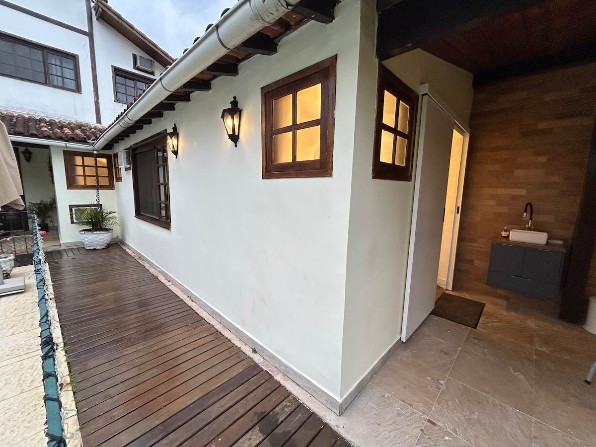 O espaço é muito charmoso, confortável e equipado com cozinha e acessórios, TV, ar refrigerado e WIFI. Tem acesso independente e fica bem perto do deck com piscina e ampla visão do Cristo Redentor ao Pão de Açúcar. Na área da piscina tem uma ducha e mais um amplo banheiro com chuveiro e água quente. Também compartilhamos nossa lavanderia. A Rua é bem servida de ônibus, taxis e UBER que pela nossa localização acaba ficando tudo perto e equidistante.