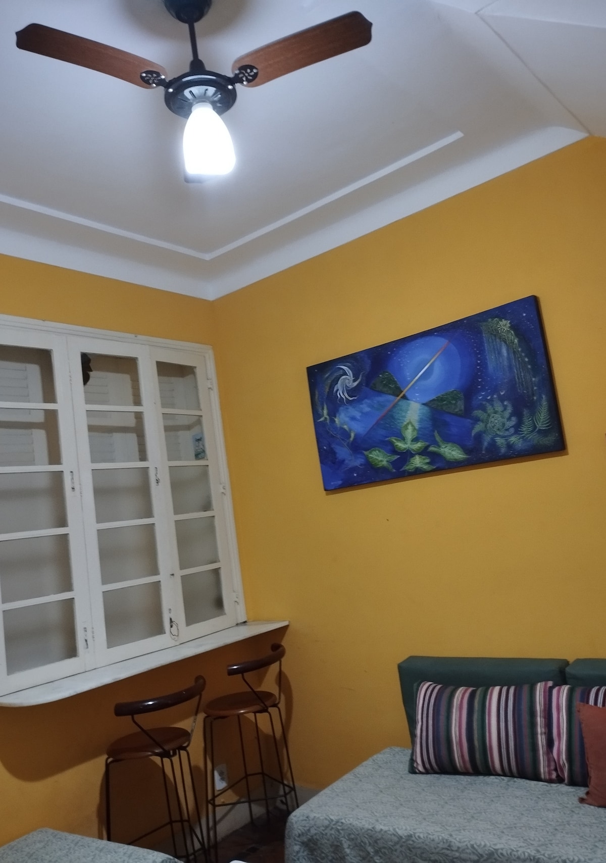 a room with an internal facing window, 2 single beds, Aircon and ceiling fan, in the wonderful and central Gloria neighbourhood😎. It's a unique 3 bedroom house in a residential & safe area, for those who seek vibrant creative and musical culture, & 5 minute walk to Glória metro station and all amenities, as well as the famous Glória Sunday Market ⭐ 15 min. walk to Flamengo Beach⛱️ ⭐ 10 min. by metro to Copacabana, and 20 min. to Ipanema. 20-30 min by Uber to Copacabana or Ipanema.