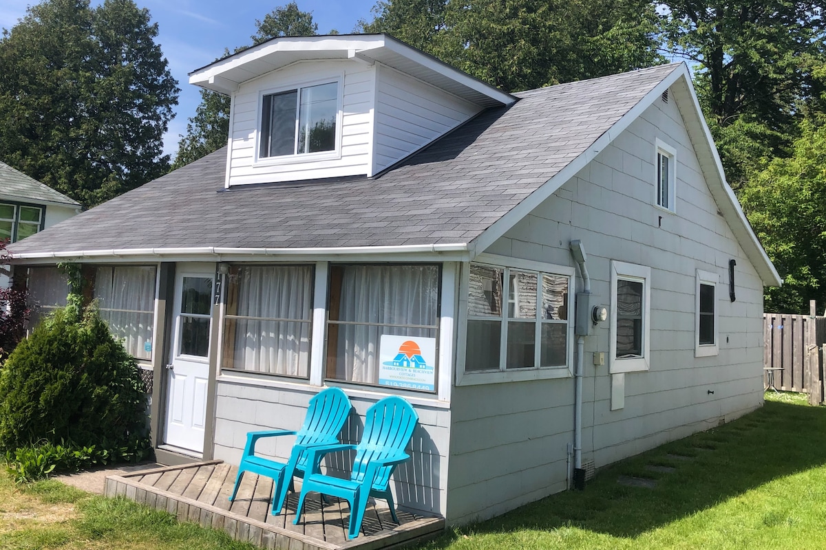 Beachfront property on Lake Huron. Great view of sunrise over the lake as cottage is facing east. At night there are amazing reflections of a full moon over the lake as well. Has a large deck and dock. Beautiful garden. This property is in a prime area on Tamarac Island in Stokes Bay. 1500 square feet with loft and windowed porch. Loft has huge desk and pull out bed if needed. Excellent swimming as on the main bay area with deep and warm waters. Back door camera in tree by parking.