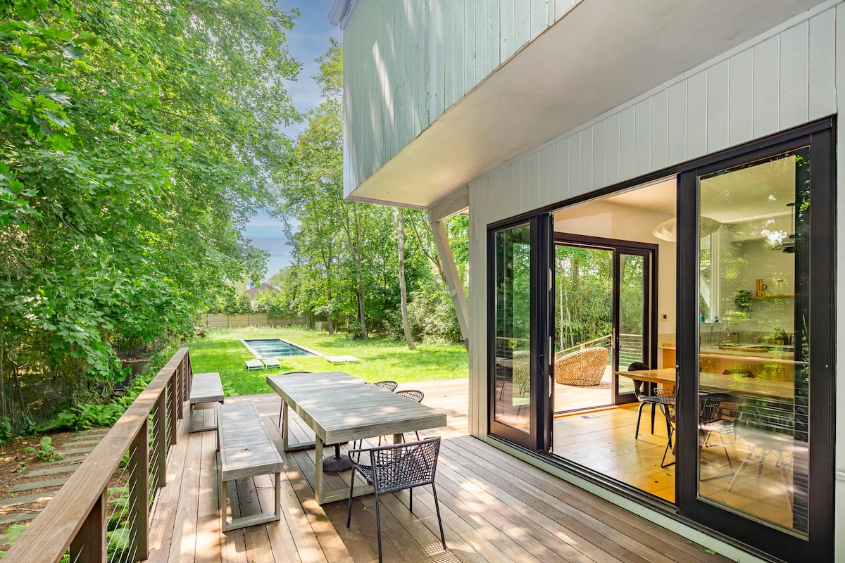 A beautifully landscaped tranquil oasis. Newly constructed private two bedroom, one bathroom guest extension to owner occupied house. Guests share large yard and pool with owner, and have private deck and seating area. Private entry and parking. Guest's may enjoy outdoor shower and BBQ. Please note there is no kitchen, however a small fridge, Keurig coffeemaker and microwave, plates/utensils are provided. Conveniently located to beaches, shopping and local restaurants in East Hampton.