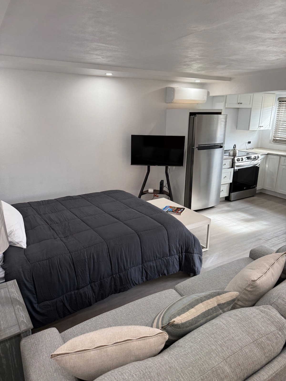 HAPPY BOOKING! Enjoy this chic experience within a very cozy and vibrant-looking studio. The full kitchen area is stocked with seasonings, pots, pans, coffee, tea, condiments, etc. In addition, the shower bathroom has most of your bathroom needs! A separate BBQ grill is placed on the upper patio deck. Dine there or relax on the loungers whilst basking in the sun or watching the sunset! Your suntan will look fantastic! Relax in the refreshing pool after a long day of exploring the island.