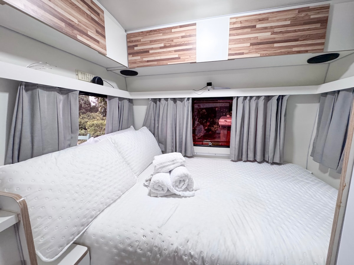 Acomodação no trailer foi pensada em proporcionar experiências e momentos inesquecíveis para os hospedes. O Trailer esta equipado com cama, mesa, sofá, armários, cozinha e banheiro além de muitos acessórios e utensílios. Na parte externa há um deck com banheira, mesa com 2 cadeiras , churrasqueira portátil e um fogão com forno a gás. Há também um banheiro externo. Uma rede suspensa para os que apreciam contemplar o por do sol e uma bela fogueira para aquecer a noite.