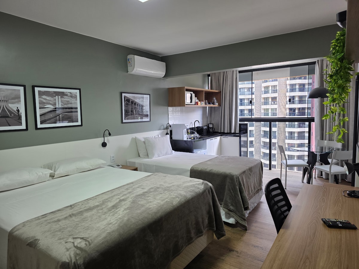 Hospede-se em um flat sofisticado, confortável e bem localizado, próximo a tudo o que você deseja visitar. Situado no Setor Hoteleiro Norte, no coração de Brasília, fica a poucos minutos dos principais pontos turísticos. O espaço é completo e aconchegante, com cama de casal, secador de cabelo, forno, ferro de passar, chaleira elétrica e outros itens pensados para garantir praticidade e bem-estar durante a sua estadia.