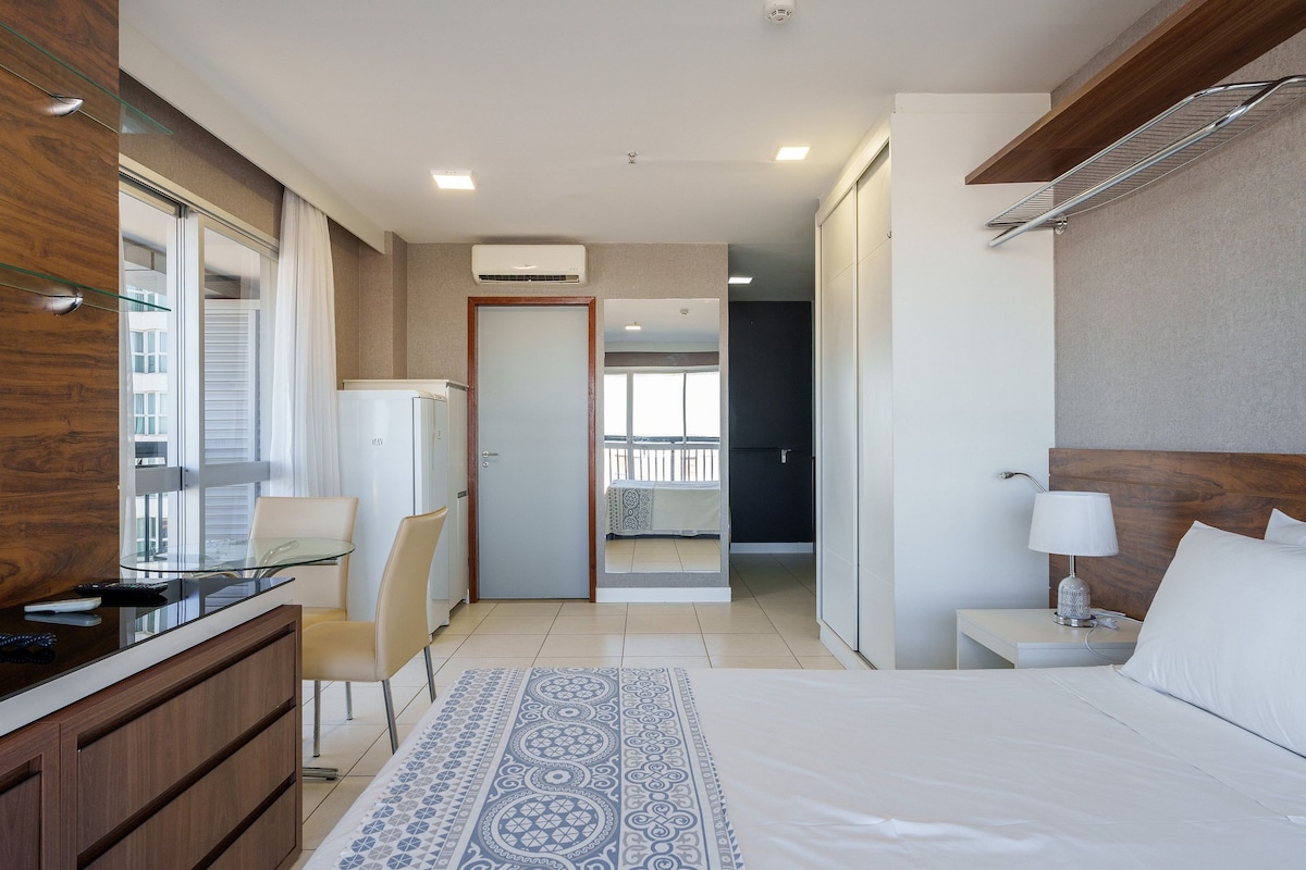 Experiência única em Brasília, seja a trabalho, lazer ou uma ocasião especial, com uma vista panorâmica para os principais pontos da cidade. Projeto sofisticado assinado por Alan Chu Arquiteto renomado, cama king size, com banheira, iluminação cênica, TV ampla, ar-condicionado, cozinha equipada e espaço de trabalho. A 50 metros do Shopping Conjunto Nacional. Dentro do Hotel Vision, temos Piscina aquecida, sauna e estacionamento gratuito. Café da manhã opcional no hotel pago a parte.