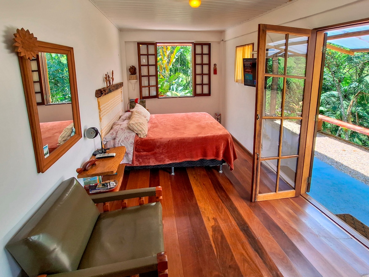 Nossa propriedade é um sítio rodeado de natureza, onde está localizado nossa moradia. Temos vista privilegiada para o mar Acomoda 2 pessoas. Temos ar condicionado, ventilador de teto, cozinha equipada com utensílios, frigobar e cooktop. Estamos a 300 m da praia da Ilha das Cabras. Não permitimos som alto, churrasqueiras Check-in a partir das 17 e check-out até as 13 hs, podendo ser ajustável, conforme a disponibilidade. Temos escadas para subir.