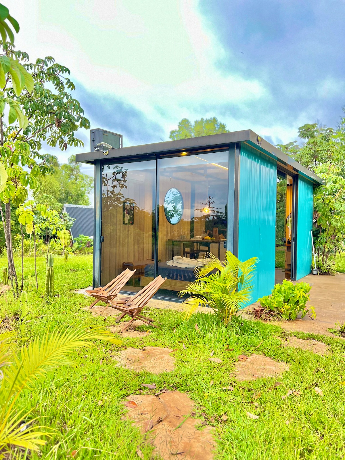 São 2 suítes com camas de casal e ar-condicionado quente/frio, garantindo conforto em qualquer estação. A sala e a cozinha são integradas, criando um ambiente perfeito para refeições e momentos descontraídos. Duas portas do container se abrem para um deck de madeira espaçoso, conectando o interior à natureza e dando acesso ao quintal arborizado. Com Wi-Fi de 500 MB, duas vagas de garagem e energia solar, essa casa une sustentabilidade, conforto e natureza, criando um refúgio ideal para relaxar.