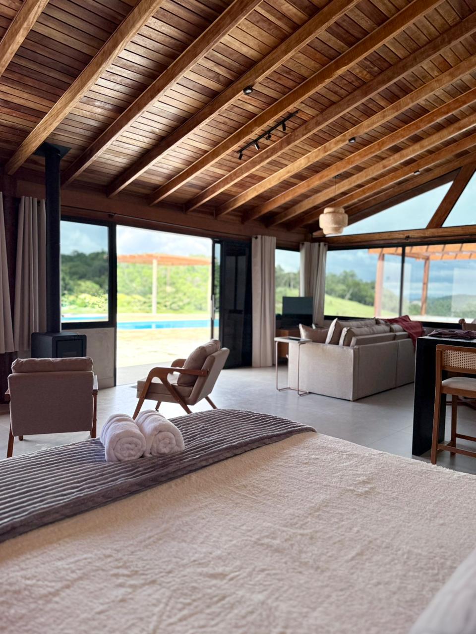 Exclusivo para adultos, este Chalé sofisticado e moderno, com vista deslumbrante do Mar de Minas, com banheira de hidromassagem fechada com janelas de vidro, podem ser usadas abertas no verão, com deck panorâmico, churrasqueira, fogo de chão e cozinha completa, Cama queen, jogo de cama e banho de altíssima qualidade, jardins, móveis externos e com estacionamento e acesso ao local todo pavimentado. Além de um mini mercado na propriedade para sua comodidade, pois não servimos café da manhã.