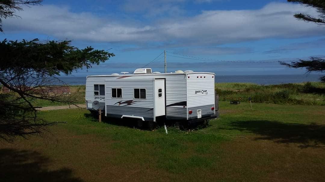 Cozy, modern RV camper with 2 bedrooms and additional sofa bed at Gagnon Beach Campground. The campground offers adult-only pool, kids playground, basketball court, recreation room and, the best, a mere walking distance from the beach. This trailer can sleep up to 6 people (1 Queen bed, 1 bunk bed and 1 sofa bed double). Air Conditioning Electricity Heat Kitchen Microwave Mini Fridge Oven Patio Private Bathroom w shower Propane BBQ Stove Propane fire pit TV (access your own accounts) Wi-Fi