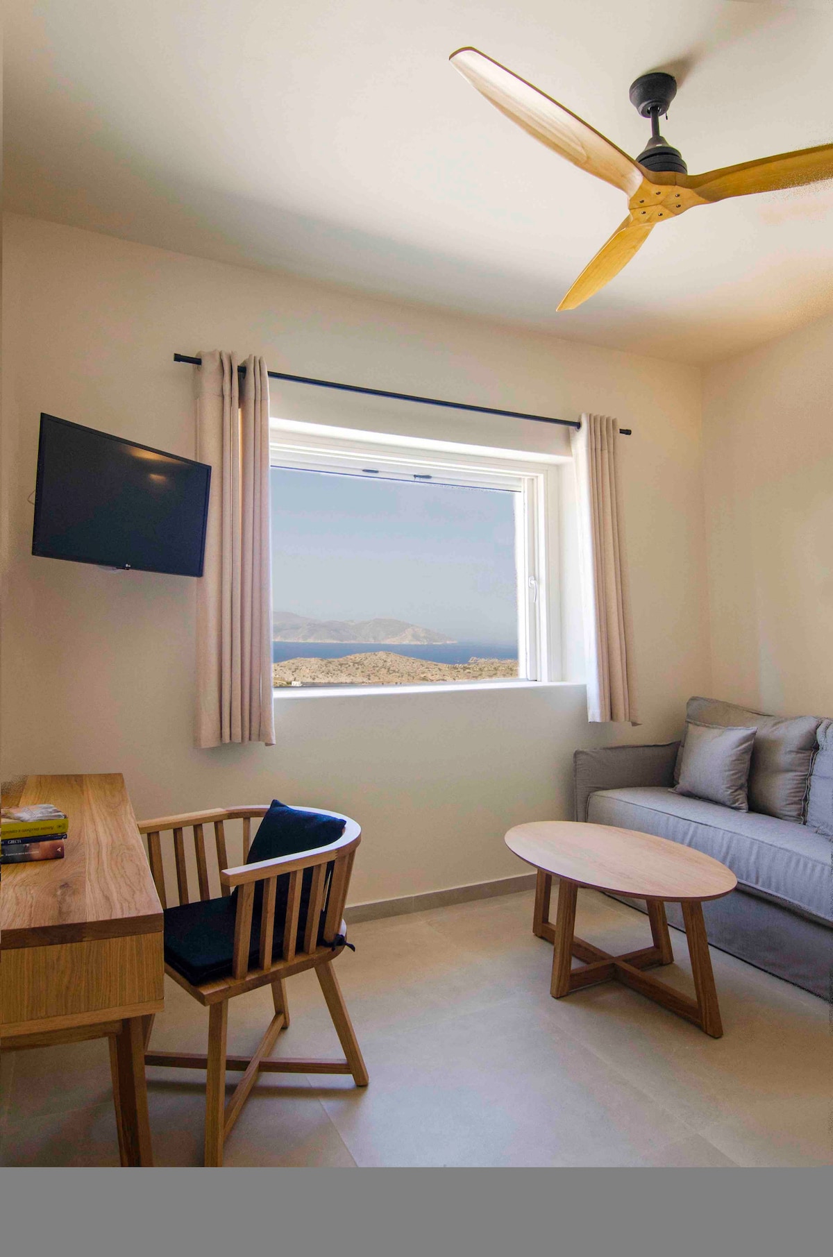 Newly built suite "AMMOS" with panoramic view of the area and the amazing sunset from our verandas. In the centre of Masouri, yet, in a quiet and isolated spot. Designed to accomodate families of four to five persons, with one separate bedroom and one double bedded traditional "kratthos". Kitchen is fully equipped to meet the demands of our guests. Next to "AMMOS", is also "THALASSA" suite, for four persons: www.airbnb.gr/rooms/27496967.