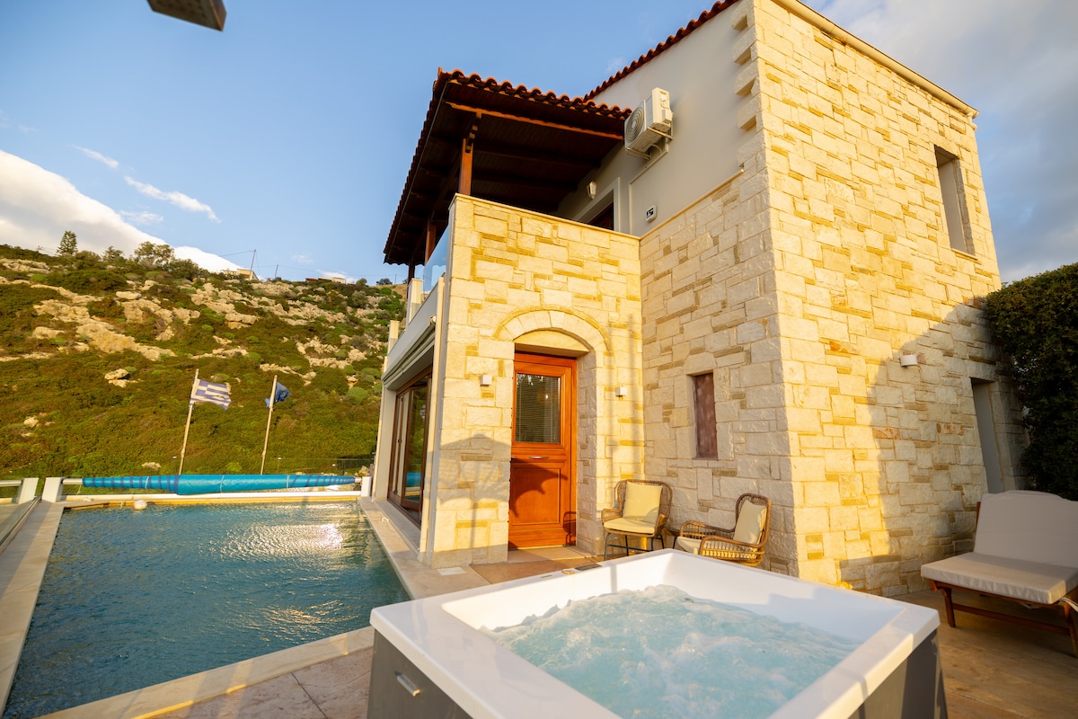 *Please message BEFORE you book. I list on many sites and my calendar may not be up-to-date. I usually respond within 1 hour* • Private HEATED pool + stunning sea view+garden • Outdoor heated jacuzzi • Sauna • Gym • Outdoor dining BBQ • Stunning sea view • Jacuzzi in the bathroom • Walking distance to Almyrida beach and its restaurant,bar,shop,taverna,market • 16km from Chania and its Old Port • Made of wood/glass/marble with details& amenities that will engage you to a luxurious lifestyle