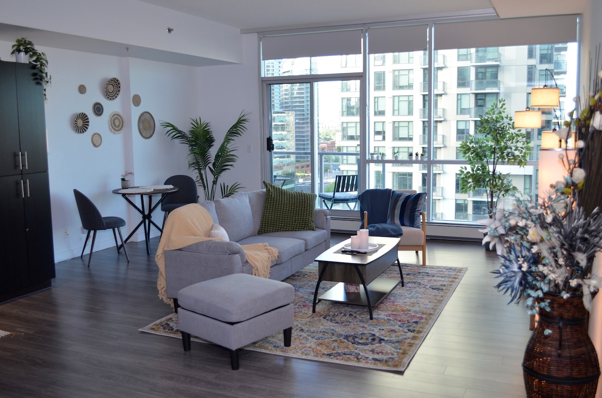 About this space This beautiful 1 bed and 1 den apartment is your home away from home. It offers all the convenience and comfort you need to make your trip memorable and comfortable Modern living space with floor to ceiling window that lets in plentiful and beautiful natural light, and offers amazing views of Downtown Calgary and Rocky Mountains in the distance Unbeatable location offers exceptional convenience to amenities and entertainment experiences. It's close to all public transportations.