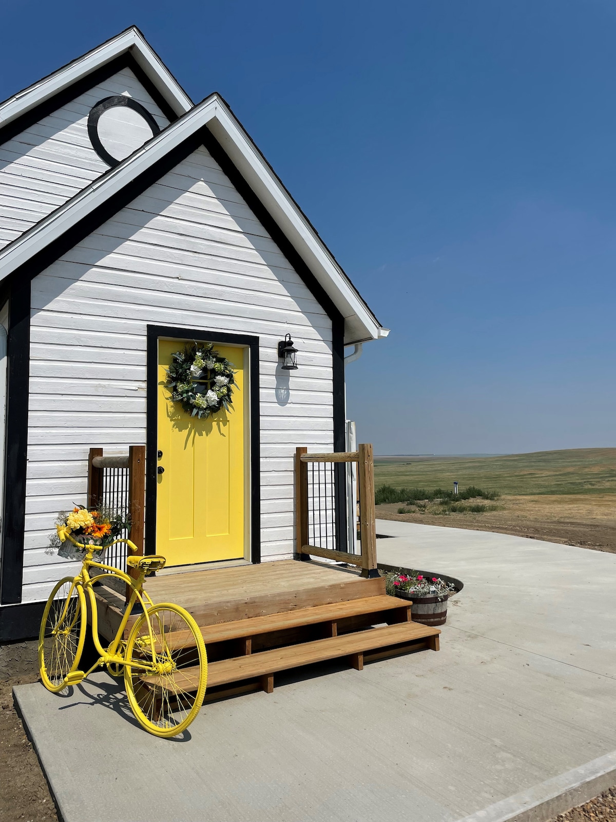 This schoolhouse is the smallest one of two on the property. Country living extends to the outdoors on the private patio. Wrap yourself up in one of our vintage handmade quilts, breathe in the fresh country air and enjoy unobstructed views of neighbouring fields. Saskatchewan is touted as the “Land of Living Skies’, and there’s no better place to see the most amazing sunsets, stars and Northern Lights. Enjoy soaking in your private hot tub while star gazing or looking out over a vast valley.