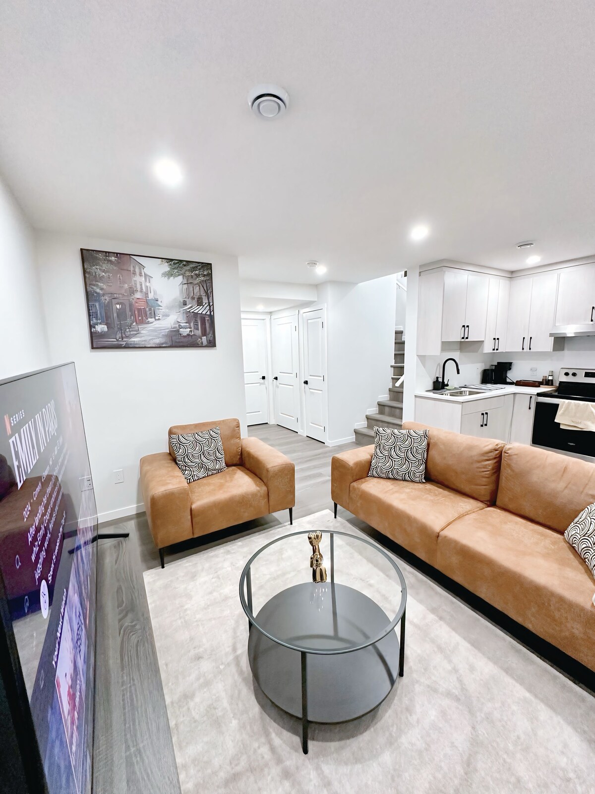 This exceptionally maintained main floor suite of a bi-level home has lots of updates and is waiting for you! The upstairs suite offers a fully equipped large, bright kitchen with island & open dining room with a large table for your family meals. Tastefully decorated spacious living room, complete with a big screen smart tv, Netflix, apple tv, DVD player and a large selection of movies for those cozy nights in. Two bedrooms with king and queen bed in each and and 1.5 baths complete the space.