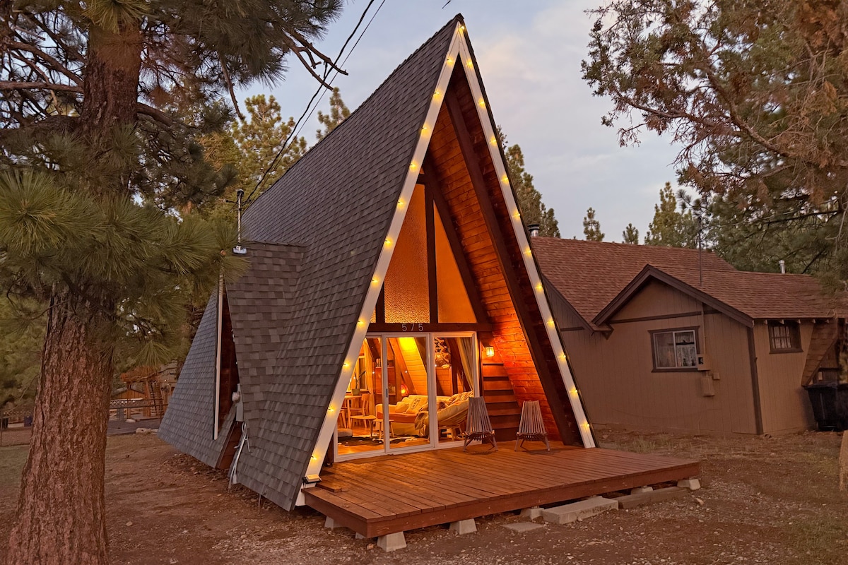 This Black A-Frame cabin sits high among the pines in Running Springs, offering peaceful treetop views from decks on all three levels. With warm mid-century modern design, it’s the perfect romantic escape. Snuggle in the cozy loft, enjoy vinyl or a movie in the secret cinema room, and unwind together in the new barrel sauna. Perfect for couples celebrating anniversaries, honeymoons, special getaways, or simply enjoying quiet, meaningful time together in the forest.