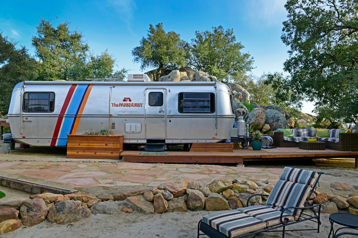 在有机牧场上的标志性 1974 款 Airstream 露营车中放松身心