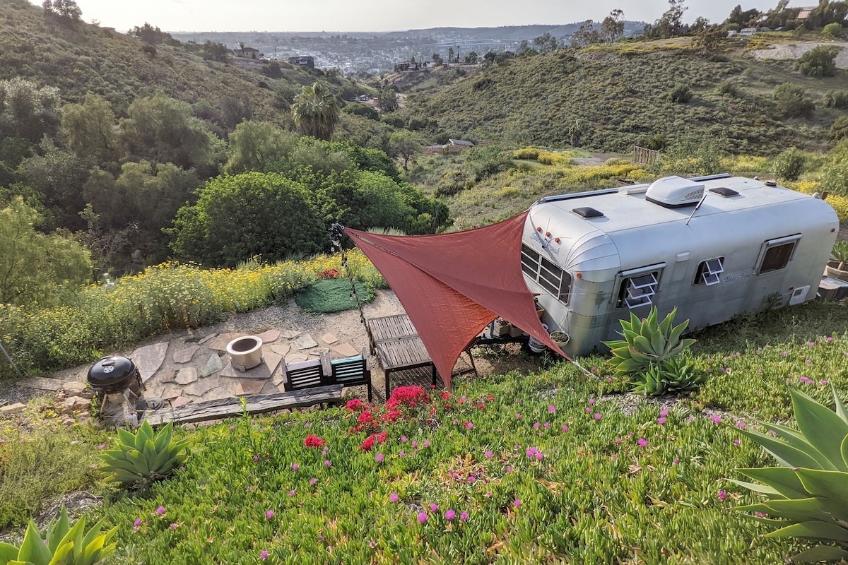 Nestled in a quiet hillside canyon with panoramic city and sunset views—just a short drive outside of downtown San Diego, this glamping retreat offers: ✦Private Hot Soaking Tub under the stars ✦Custom wood-fired sauna ✦Golf chipping tee ✦Fast Wi-Fi ✦AC & Heat ✦Gated, off street parking Cozy up by the fire as the city sparkles below or try your swing at the golf tee. Reconnect & recharge in your own outdoor hot soaking tub, rain shower & wood-fired sauna - the perfect retreat for nature lovers!
