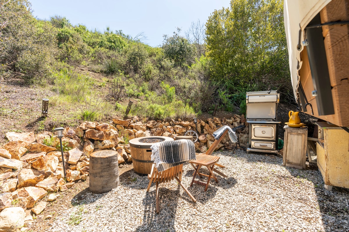 Experience luxurious glamping comfort in a Pioneer Conestoga wagon w/ King Bed! With a plush bed & matching bunks, our wagon is perfect for a romantic weekend, family adventure, girl's/boy's trip, or just for a few days away! Nestled in the gorgeous Santa Monica mountains with beautiful views and oak trees, this stay is a full retreat! Next door sits Prospector Ranch with an authentic saloon, horses, & hiking & biking trails. LA, the 101 freeway, beaches, breweries & wineries are minutes away!
