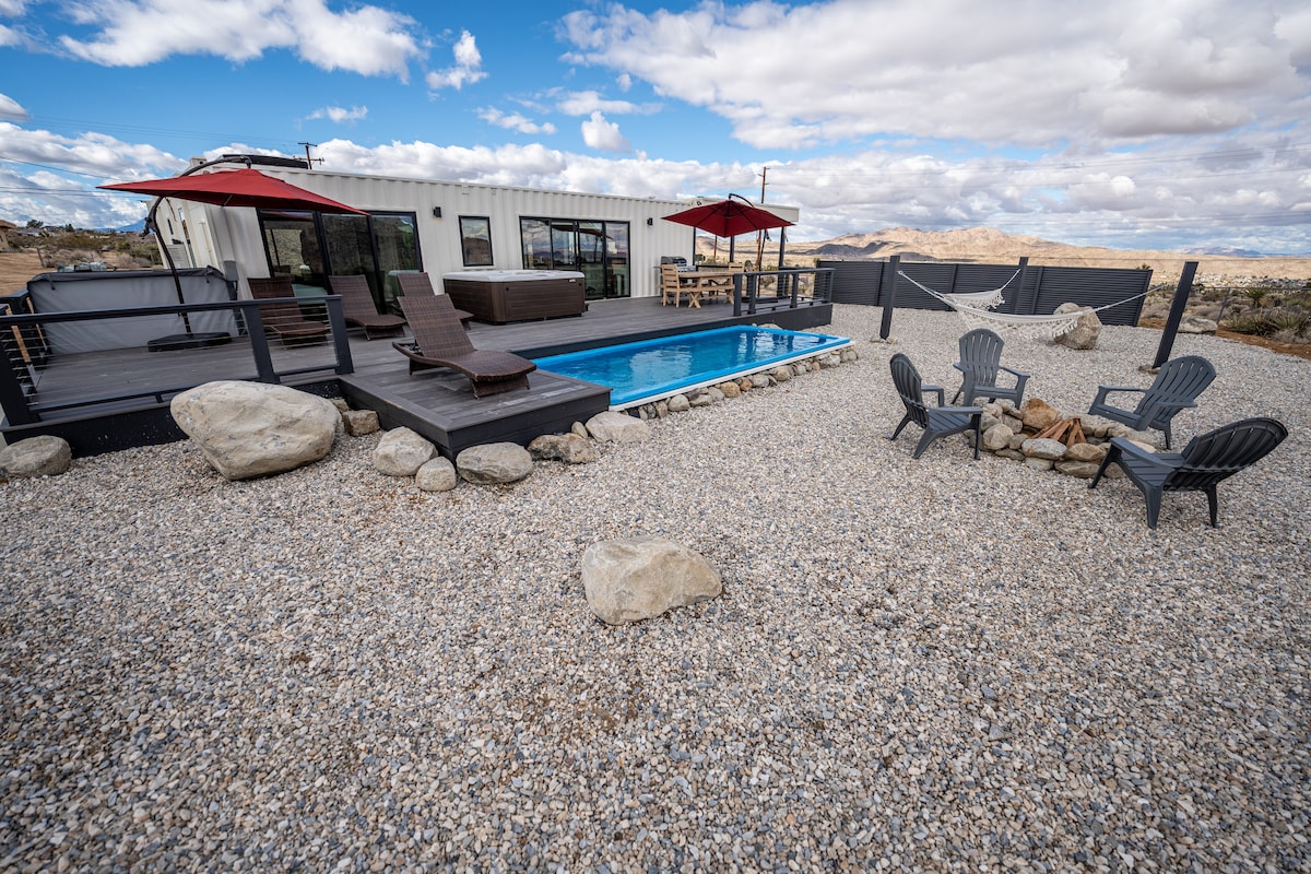 Welcome to Blok Studio. This is a new, modern one-of-a-kind container home, which features (4) 40ft high cube shipping containers, DirecTV, large wrap around deck, 20' container HEATED pool plus hot tub!! Great place to unwind in the serene outdoor living areas, complete with breathtaking views of the Joshua Tree landscape. Property is located on the south side of the 62 Highway. Just 1 mile from the downtown area and four miles minutes to the West entrance of the Joshua Tree National Park!