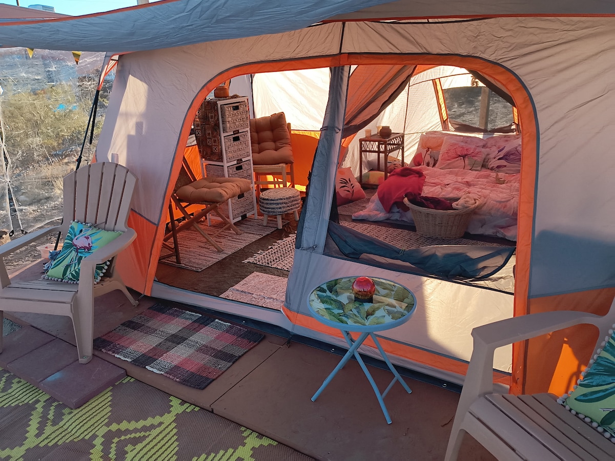 This is a camping space with a tent provided. You have access to bathroom and shower, and washer and dryer if you need. Designed for 2 people. Fire pit and Gas Grill available for use. You need to bring your sleeping gear, cooking items, and will enjoy a sky full of stars. Our property is peppered with a bit of the Old West; great antiques to check out on the grounds. A nice 5 acre parcel fenced and 3/4 of a mile off of the freeway.