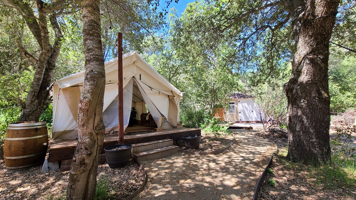 Experience old west fun & luxurious comfort in a real Safari Tent. With a plush queen bed, our tent is perfect for a romantic weekend, family adventures, girl's/boy's weekends, or just for a few days away! Nestled in the gorgeous Santa Monica mountains complete with beautiful views and grand oak trees. Next door sits Prospector Ranch with an authentic saloon & horses.. hiking & biking trails. The 101 freeway, LA, beaches, breweries & wineries are minutes away!