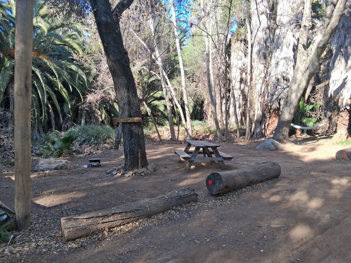 Tucked under a grove of oak trees, and encircled by manzanita trees, sits "Manzanita Cove". A private glamping site that contains everything you will need for an amazing experience! We provided: drinking water, electrical outlets, propane, fire pit, full outdoor kitchen with mini fridge, full bathroom with indoor and outdoor hot water showers and more. Book with the main house "Julian's Red Fox Retreat", or separately for a romantic getaway! Explore luxury glamping at it's best. Pond is Dry.