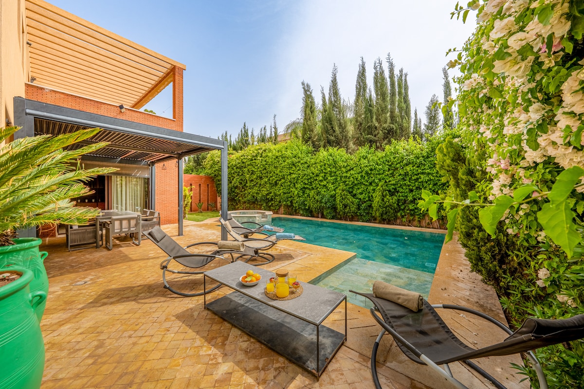 BIENVENUE A VILLA PAX ! ✨ Une villa moderne pensée pour le confort, la lumière et la détente, idéale pour profiter pleinement de Marrakech en toute tranquillité. Ici, vous profitez d’un véritable espace de vie intérieur/extérieur, avec piscine privée, terrasse ensoleillée, sentiment d'espace, de confort, de tranquillité, et d'intimité. 📌 À proximité (environ) : 15 min – Aéroport Marrakech Menara 13– Centre-ville / Guéliz 15min - Jemaa el-Fna Accès rapide aux principaux axes