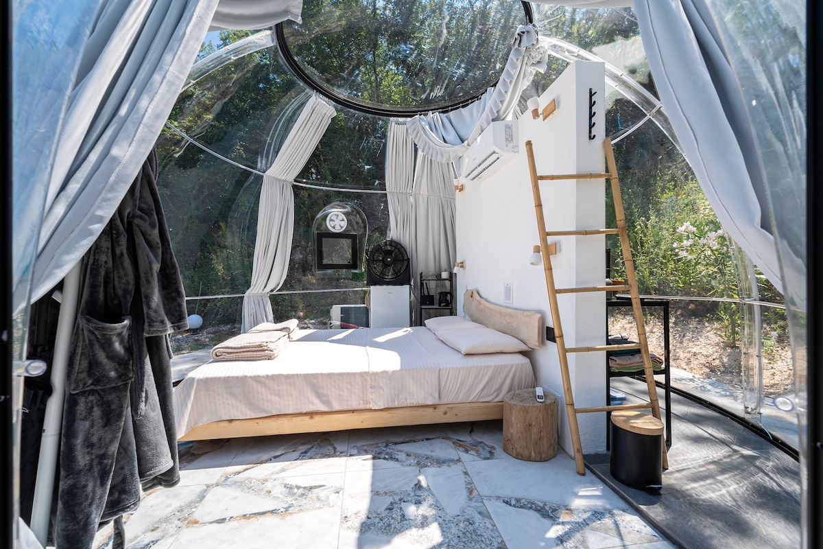 Au creux d’une forêt, Bublina vous accueille pour une expérience hors du commun. Isolée dans la plus grande intimité, cette éco-bulle transparente est aménagée chaleureusement dans le plus grand des conforts pour une nuit cocooning sous les étoiles. Accompagnée de sa salle de bain au toit transparent et de son solarium à vue panoramique, chaque lieu vous permettra d’apprécier le ciel et le calme à toute heure. Couché dans un lit king size, lumières éteintes, laissez-vous porter dans les étoiles.