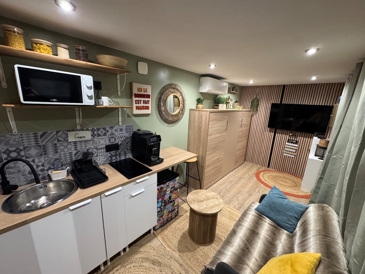“Nous vous proposons un charmant studio atypique et entièrement équipé, aux portes de Toulouse. Ce logement comprend une salle de bain, une cuisine bien aménagée et un coin cosy avec un lit Queen Size. Situé dans un environnement calme, il dispose d’un parking privé et sécurisé. À seulement 20 minutes en voiture ou en bus (ligne 58) de Toulouse, c’est le lieu idéal pour les professionnels en déplacement, les visiteurs familiaux ou un week-end en amoureux.”