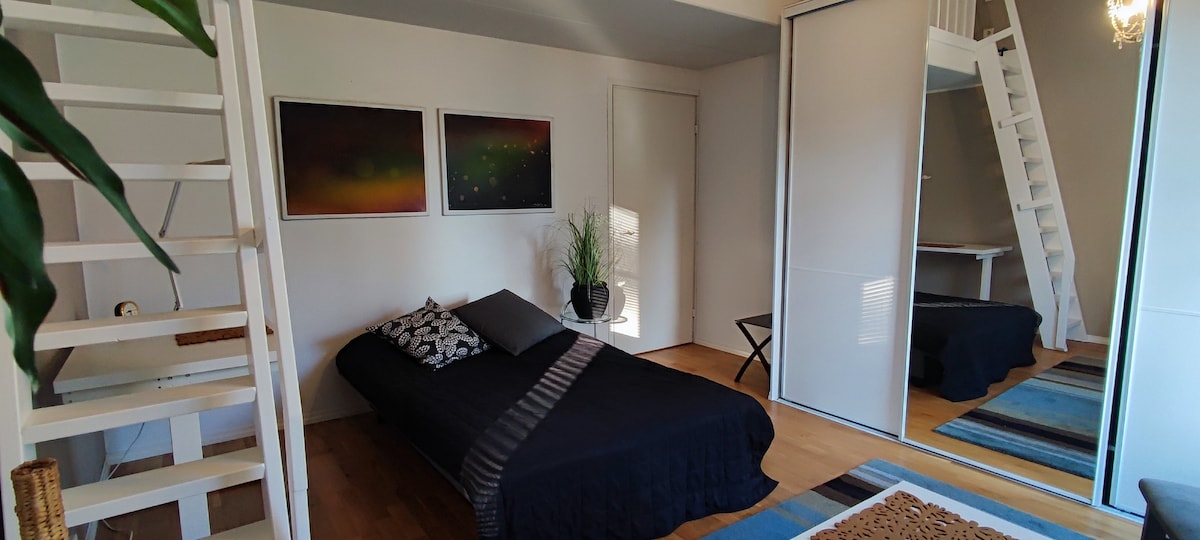 A funky compact one room flat in a wooden house nestled in a quiet & beautiful neighborhood.Features a kitchen, bed is up in a loft, sofa, kitchen table, toilet, wooden sauna and a shower. Underfloor heating throughout the apartment. There is a small yard and terrace where you can enjoy your breakfast outdoors. Travelers have access to entire apartment. Sheet and towels are included. There is only 300m to grocery store and 1.2 km to center.