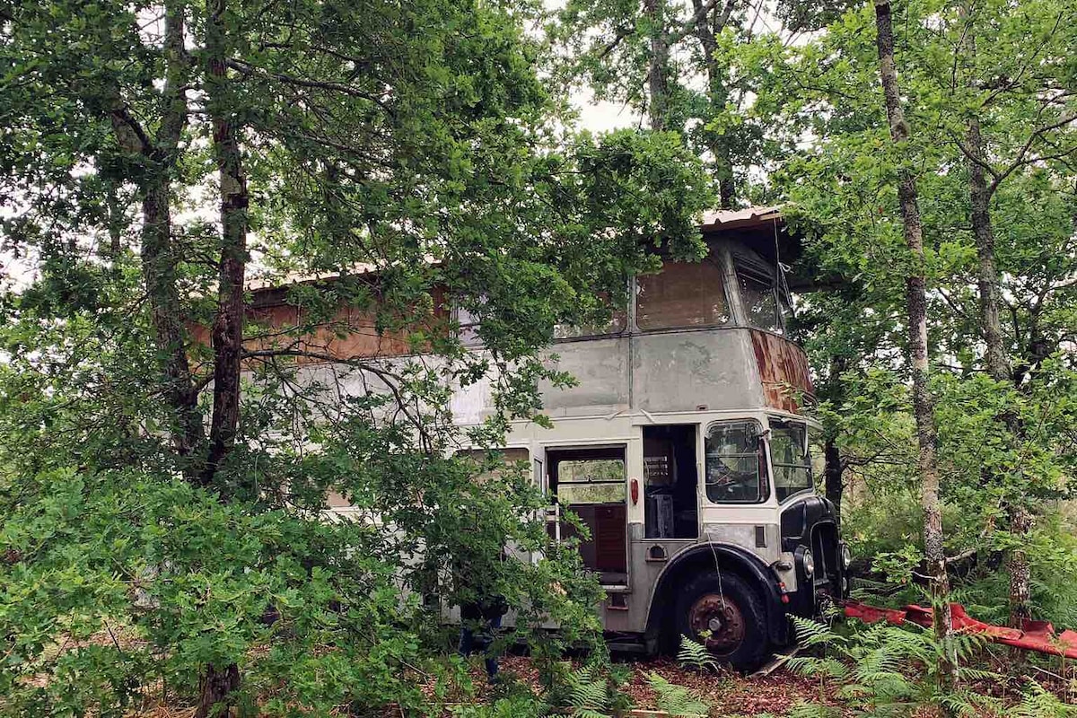 location en logement insolite d'un bus à impérial britannique de 1957 en pleine nature dans le parc naturel régional du Verdon, proche du lac de sainte Croix et des gorges du Verdon. Emplacement privatif pour le stationnement des véhicules. Terrasse ombragée. Présence de nombreux animaux ( chiens, chats, chèvres, poules). RDC salon et cuisine équipée, étage chambre et salle de bain. Linge de maison et toilette inclus. Idéal couple, jusqu'à 3 personnes. coordonnées GPS : 43.80534800, 6.14345700.
