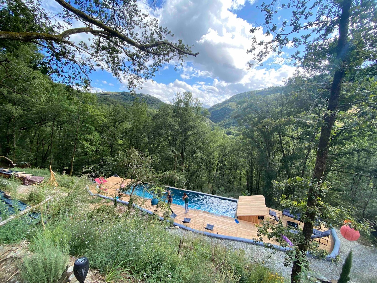 I built my wooden house entirely and finished it in early 2024. I offer it for rent during the high summer season but also during the other 3 seasons which each offer their advantages. The creation of the sauna with its wood stove is to be able to enjoy the swimming pool in all seasons. (paid option) The swimming pool is not overlooked and offers a beautiful view of the valley and its natural landscape. This valley is also home to the village of Conques and its magnificent abbey church.