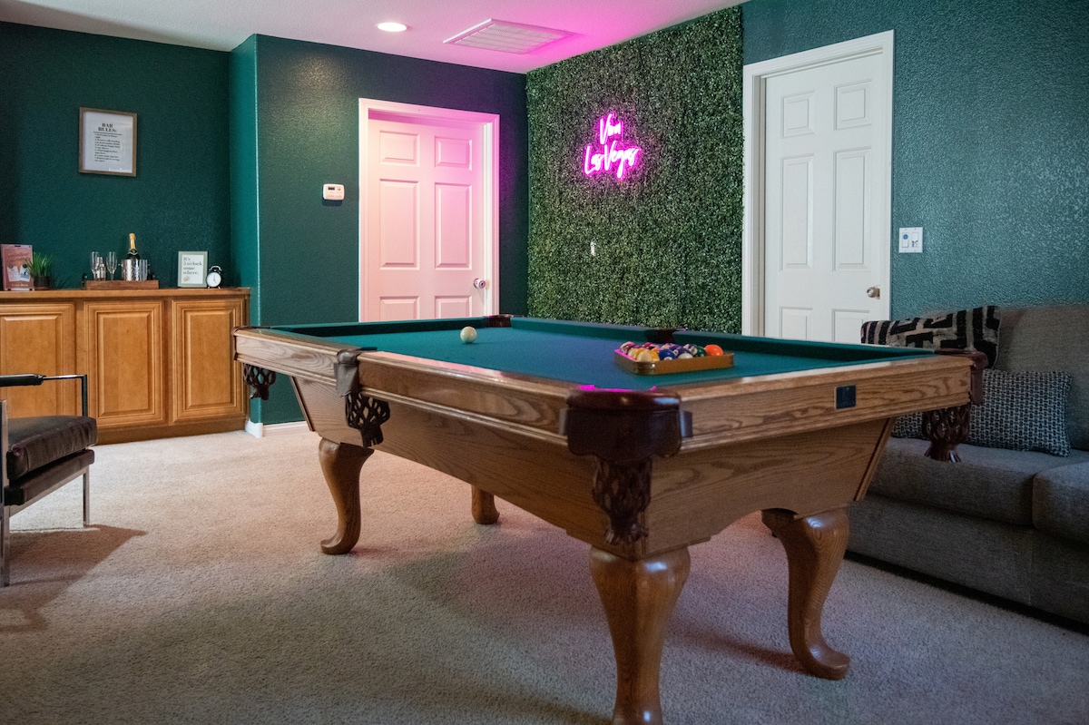 Welcome to our stunning Las Vegas retreat, moments away Strip. Our stylish home offers an unforgettable stay. Be captivated by the stunning interior, designed to give an exceptional experience. The focal point of this house is our game room lounge, complete with a pool table, offering hours of entertainment. Indulge in our king-size master suite, where you can unwind after an exciting day exploring the city. The spaciousness of this home provides the utmost comfort during your stay.