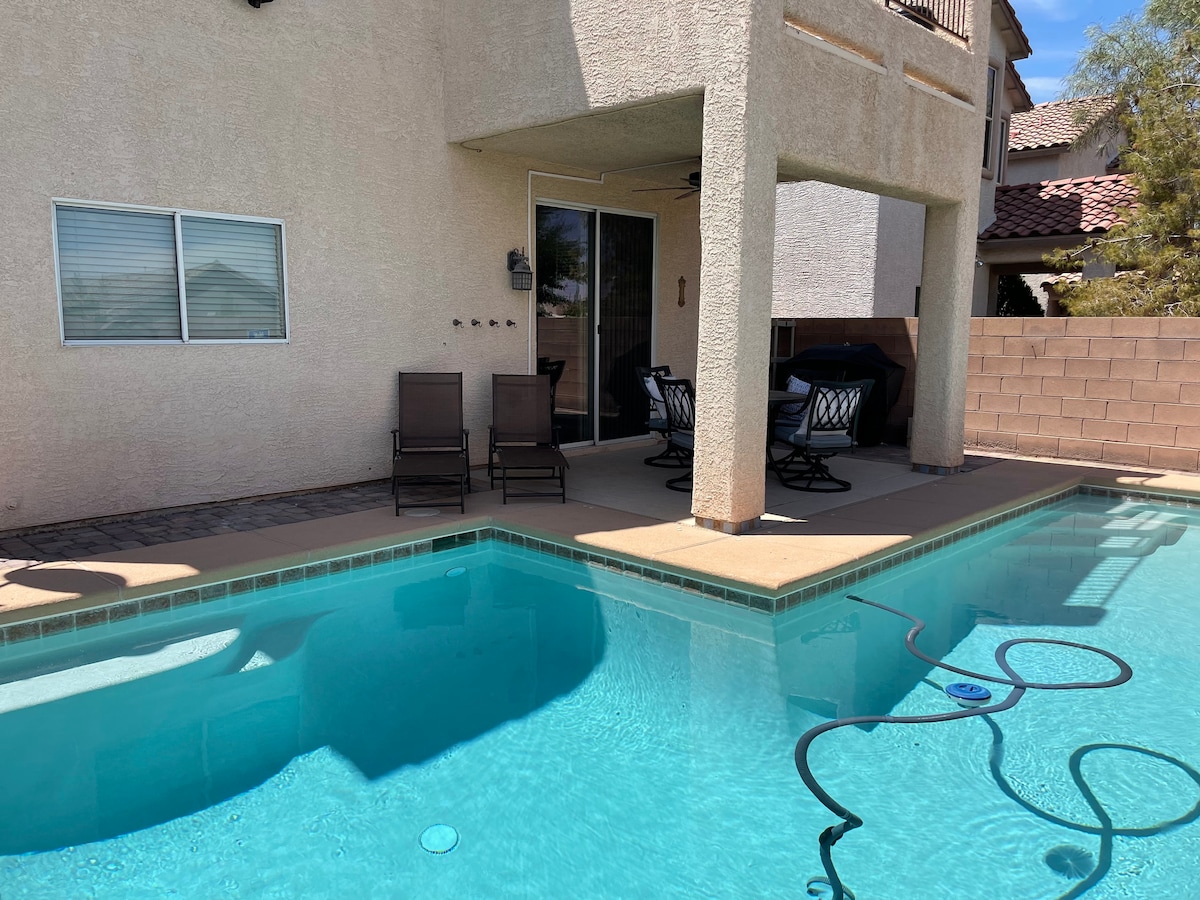 Escape to our 1-acre desert oasis in Las Vegas! Our home offers a unique blend of coziness and excitement, with a balcony boasting stunning mountain views and a glimpse of the vibrant Las Vegas Strip. 1200 sqft of living space for up to 4 person, 22’ pool 4’ depth with slide, Pickleball and basketball Enjoy a short par 3 golf course right in your backyard, . Experience the magic of the desert landscape, just a short drive from the bustling Strip. Your adventure awaits here in this desert haven