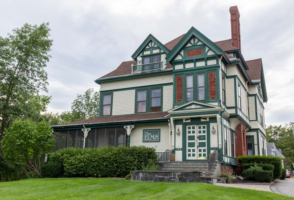 The Elms is conveniently in Westbrook, with easy access to Portland and the Interstate. The Cumberland room has two queen beds, private bathroom with shower stall, and closet. The room is defined in character by the large imperial rug. Historic Building, built by a renowned architect, originally served as a luxury Maine resort to entice business to the local mill. Featuring splendid carved wood features, fireplaces, spacious rooms, and a screened veranda overlooking the river.