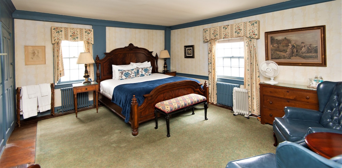 This spacious first-floor waterfront cottage offers a modern escape just steps from the water. Separate from the main inn, it features a comfortable seating area, a luxurious king-size bed, and expansive views of the Tred Avon River right outside your window. Thoughtfully designed with contemporary furnishings, the room includes a full bath with shower over tub and a convenient in-room fridge. Enjoy privacy, comfort, and unbeatable scenery in this serene Eastern Shore retreat.