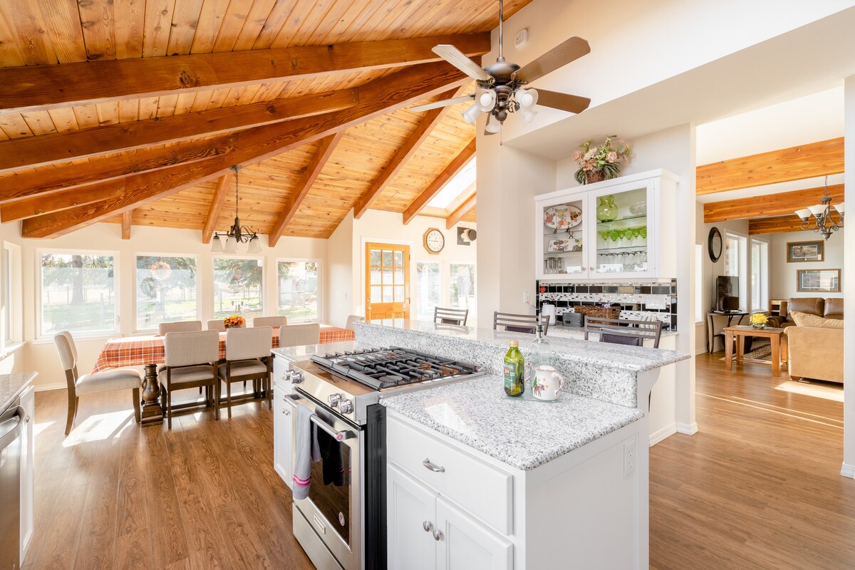 The main house was a Historic Barn built in 1910 and converted to a home in 1979. Located on almost 6 acres. High ceilings, spacious rooms, lots of natural light and awesome views of the grounds. 4 Bedrooms of which 2 are Master Suites, I master is on the main level. The main level is step free with wide doorways. The kitchen is spacious, well stocked with appliances, dishware and cookware. There is both a gas range/oven and wall oven, perfect for entertaining.
