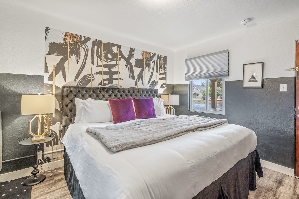 A 2nd floor room in our stylishly reimagined boutique stay in the heart of Eugene, Oregon. Just minutes from the University of Oregon, Downtown, and 5th Street, each of our 11 uniquely designed rooms offers plush mattresses, AC, upscale bath amenities, tiled showers, HDTV streaming, & free Hi-speed WiFi. Immerse yourself in Pacific Northwest-inspired art and comfort. Coffee station, Mini-Fridge & freezer. Perfect for travelers looking for charm, convenience, and a curated Eugene experience!