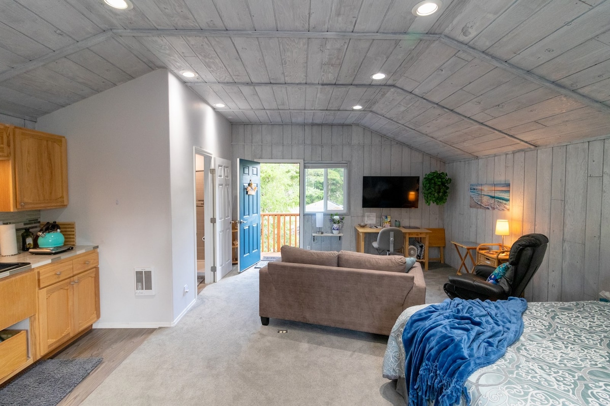 Spacious studio in forested South Eugene. Private entrance & bath. Vaulted ceilings, skylights, kitchenette, access to outdoor areas on lush half-acre. Close to bike, running/hiking trails. Easy walk to pubs, groceries, coffee, bakeries. We are open to as little or as much interaction as you’d prefer — we’re happy to chat about things to do/see, but understand if you simply want private time. NO SMOKE/VAPE IN/OUT. PET: PRIOR APPROVAL REQ., max 25 lb. short-hair only, $35 add. clean fee