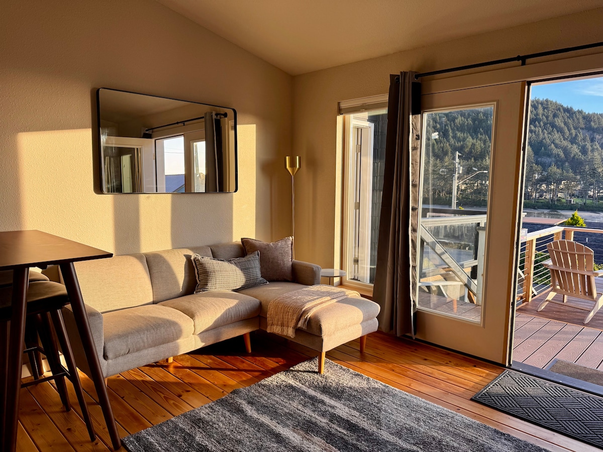 Ocean Cove Inn #8– Ocean-View Studio Overlooking Yachats Beach | Queen Bed | EV Charger | Walk to Town & Tidepools Wake up to the sights and sounds of the Oregon Coast at Ocean Cove Inn #8, a cozy studio with sweeping ocean views just above the beach where the Yachats River meets the sea. This light-filled retreat is perfect for couples or solo travelers looking to relax, recharge, and explore everything this vibrant coastal village has to offer — all within walking distance. The Space * Stylish studio layout with queen-size bed and beachy décor * Large windows with panoramic views of the Pacific * Mini fridge, microwave, coffee maker (Keurig) * Cozy sitting area with smart TV and reading nook * Private bathroom * Free EV charging on site * On-site parking and easy self-check-in Highlights * Overlooks the beach, tidepools, and scenic river mouth * EV charging available — great for road trippers * Located in the heart of town — just steps to restaurants, coffee shops, galleries, and the shoreline * Ideal for peaceful mornings, storm watching, and sunset strolls * High-speed Wi-Fi for remote work or streaming * Shared outdoor space with seating to enjoy ocean breezes * Free shared laundry room (washer and dryer) Walk to the Best of Yachats No car needed — you're just a short walk from these local favorites: * Luna Sea Fish House – fresh-caught seafood and casual coastal charm * Drift Inn Cafe - an eclectic and unique style dining experience with fresh local dishes for breakfast, lunch and dinner. Directly next door! * Ona Restaurant & Lounge – elevated Pacific Northwest cuisine with river views * Bread & Roses Bakery – artisan pastries, coffee, and breakfast bites * Green Salmon Coffee Co. – quirky café with organic drinks and vegan options * Yachats Brewing + Farmstore – wood-fired pizzas, craft beer, kombucha, and a local hangout vibe * Le Roy’s Blue Whale – classic diner fare and hearty breakfasts * Outta Gas Pizza – hidden gem with creative pies and laid-back atmosphere Nearby Adventures * 5-min walk to Yachats State Park * 10-min drive to Cape Perpetua Scenic Area, Thor’s Well & Devil’s Churn * Easy day trips to Florence, Heceta Head Lighthouse, or Newport’s aquarium and harbor Essentials * Sleeps 2 guests max * Check-in: 4pm | Check-out: 10am * Quiet hours: 10pm–8am Come enjoy the peace, views, and walkable charm of Yachats from the comfort of your own private perch above the Pacific. Whether you’re beachcombing, dining out, or just watching the tides roll in — Ocean Cove Inn #8 is your perfect coastal base. Book now and treat yourself to a true Oregon Coast experience!