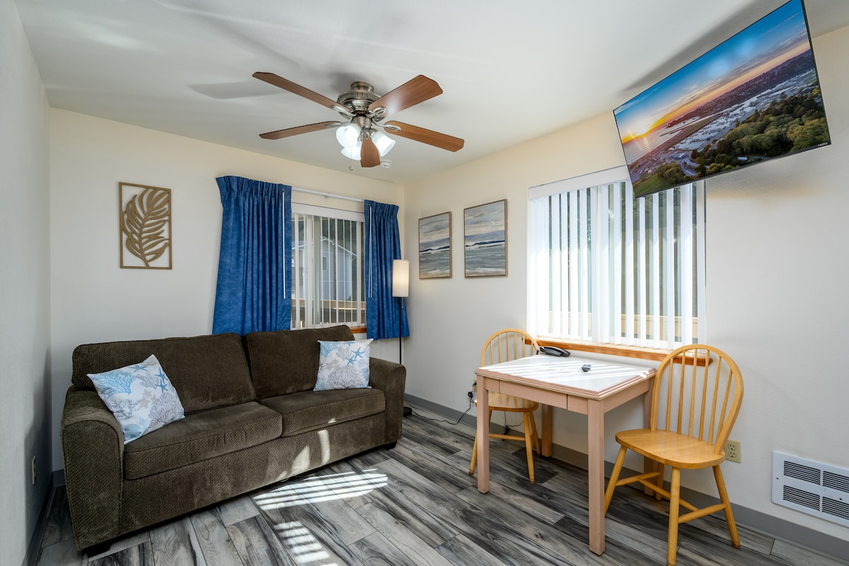 This cozy retreat is just a short walk to Sporthaven Beach, wine tasting, and local dining favorites. Your second-floor suite (no elevator) offers an open living/dining/kitchen area, plus a separate bedroom one queen bed and a bathroom. Relax with cable TV, free Netflix, and high-speed fiber internet. For longer stays, we provide weekly cleaning to keep things fresh and comfortable.