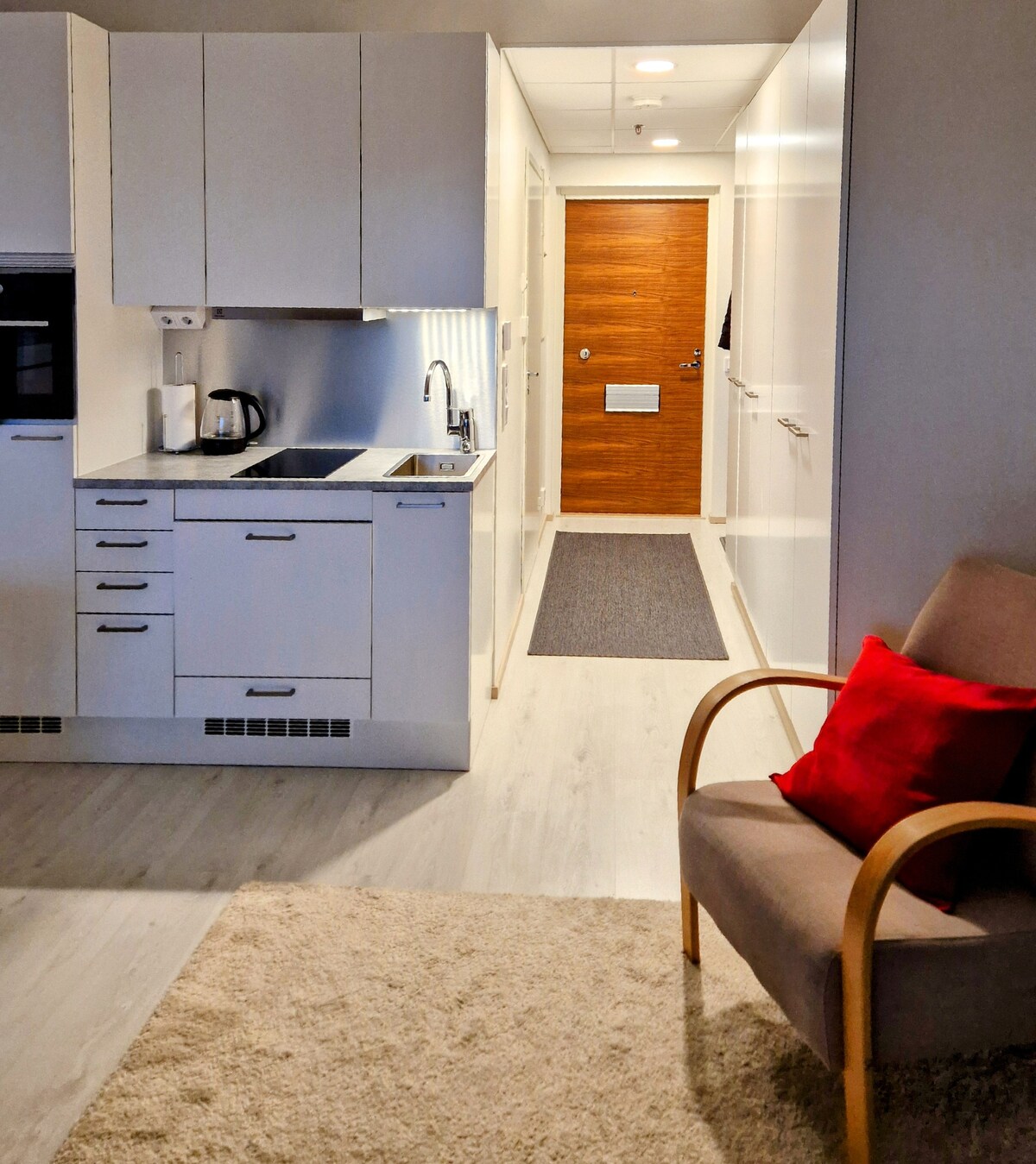 As far as locations go, it doesn't get much better than this! The studio is located in the heart of the city center, just a few steps from Nokia Arena - and you can park your car in the garage directly below the building. This second floor apartment's interior is designed to give a hotel room vibe, and the big, comfortable bed guarantees a good night's sleep. The studio features a large glaced balcony, a portable air-conditioner and a full-size bathroom with a washer. Welcome 😊