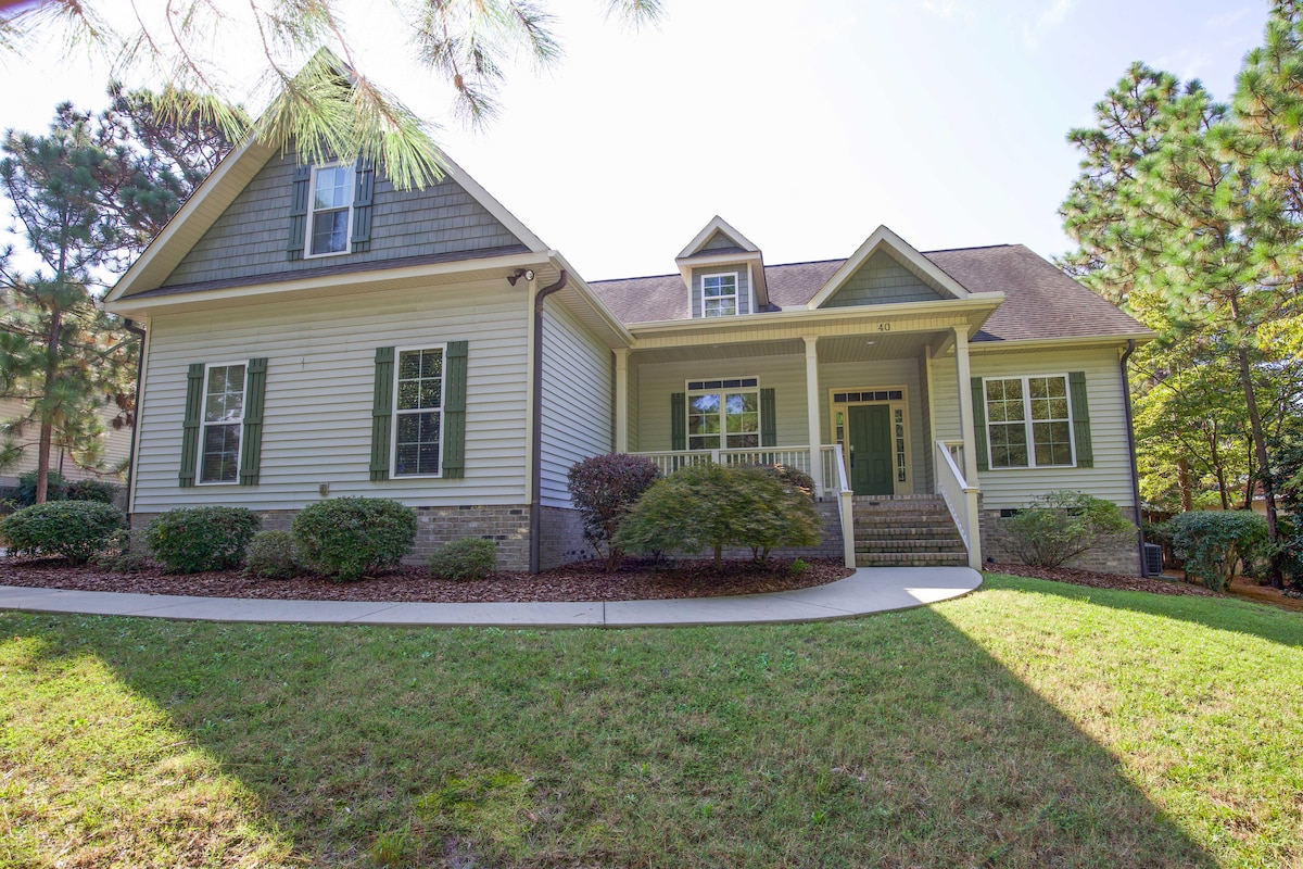 Your entire group will enjoy this central location to 40+ golf courses in Moore county with easy access to restaurants and close to grocery stores. This gorgeous home with custom woodwork and backyard oasis is the perfect retreat for families and golfers alike. Enjoy comfortable beds with down pillows and high end mattresses with mattress pads and a fully stocked kitchen in this newly furnished home. If you appreciate the little things like HEPA air filters and quite dishwashers, we got you.