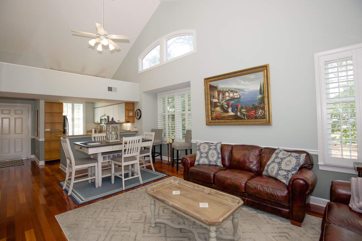 Across from the Harness Track and an easy walk to the main clubhouse at Pinehurst sits our villa on the 2nd hole of the Ellis Maples designed Pinehurst No. 5. Our newly renovated 2nd floor unit has 3 bedrooms, 2 bathrooms and and open floor plan. With seating for 8 and 5 beds, you can bring the whole family comfortably. Cook dinner in the kitchen equipped with new stainless and enjoy a glass of wine out of the cooler. This unit has two porches, and both are great for your morning coffee.