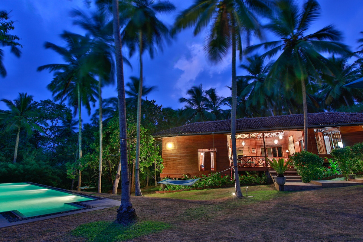Private luxury villa & pool, AC, fans, generator, workspace Easy access to all Hikkaduwa has to offer Free high speed WiFi, Cleaning. Cable TV Sleeps 6 +baby Private Chef option 2 Superking 1 Kingsize bedrooms, 3 ensuite power shower rooms Spacious interior & shaded veranda outdoor living area Large sunny tropical walled garden Supported stay with Chef/Villa Manager & Driver on call Cleaning every 2 days, bedding/towels Peaceful neighbourhood 5 minutes to beach Airport transfers /Tours arranged