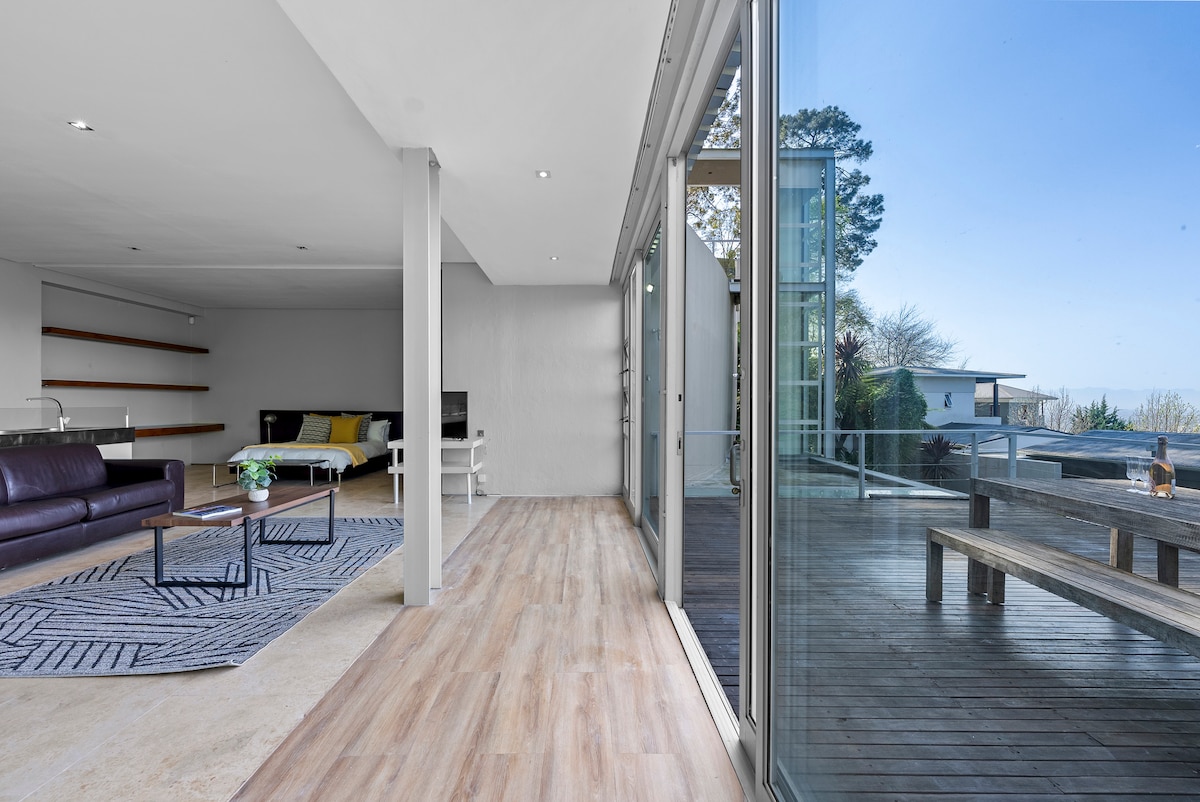 Our studio apartment opens up onto a 40sq meter balcony with a panoramic view of the Hout Bay Valley and the Helderberg mountains beyond. Large sliding doors disappear into the walls creating an unimpeded indoor/outdoor flow while the elevated position protects your privacy. The open plan bathroom faces onto an enclosed secret garden which includes a frame-less glass shower. The unit has a fully equipped kitchenette and is serviced daily except weekends and public holidays.