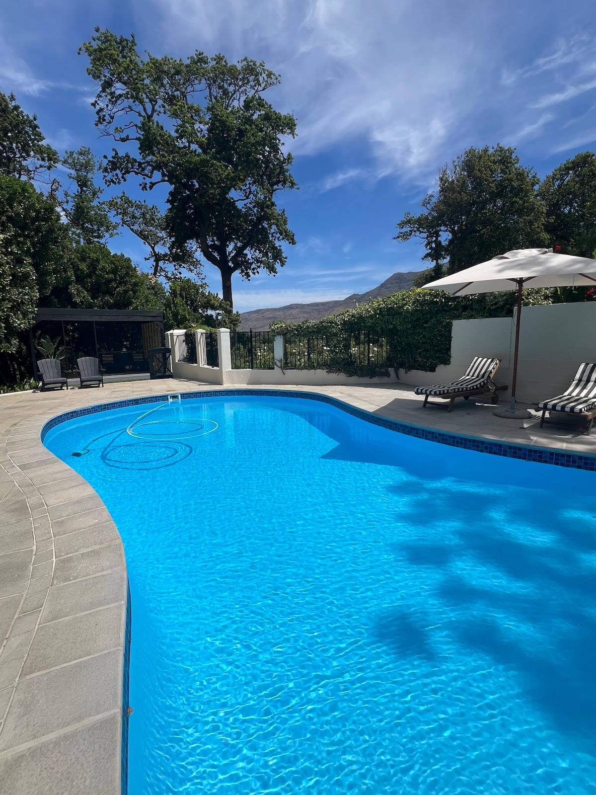 Self-contained cottage nestled in the picturesque neighborhood of leafy Constantia. Conveniently located, within walking distance of the Shopping Center and close to the renowned Constantia Vineyards. Immerse yourself in the tranquil ambiance of the large garden, complete with a sparkling swimming pool . There's a trampoline and swings nestled among the trees, providing endless fun and entertainment. The property is safeguarded by 24-hour security. -Inverter for Wifi, TV, lights -Gas Hob
