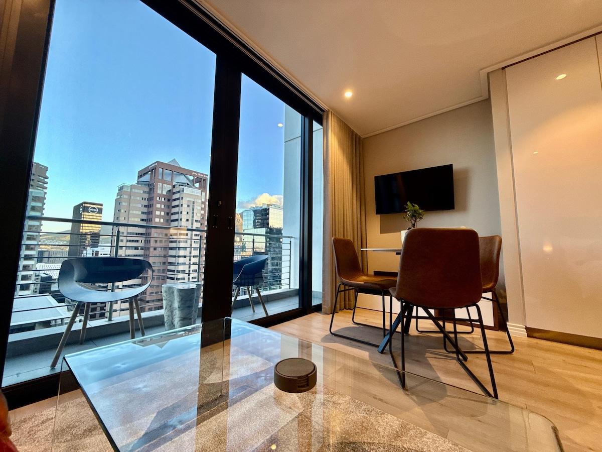 A chic, modern apartment with a big balcony, in the heart of trendy Bree Street, surrounded by top-notch restaurants and just a short walk to all city highlights. Stylishly decorated with all amenities for a super comfortable stay. Perched on the 21st floor, enjoy breathtaking views of the city, Stadium, Robben Island, Signal Hill, and the sparkling sea. Relax on the rooftop terrace with a refreshing drink from the bar. Just a stroll away from the CTICC and the V&A Waterfront. @CapeTown16onBree