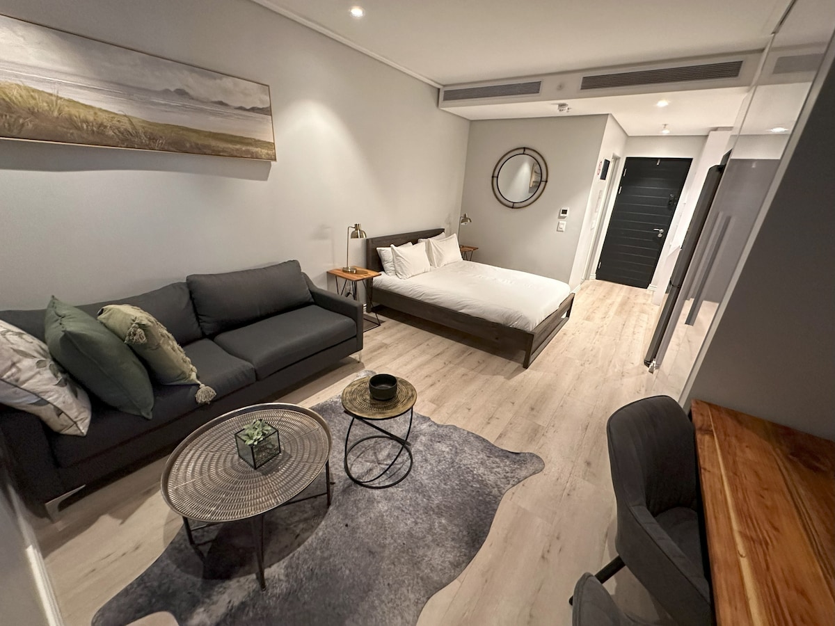 Exceptionally stylish studio apartment in trendy Bree Street. Walking distance to Cape Town's best restaurants, bars and galleries. Fully equipped apartment, with wifi, smart tv, AC, communal outdoor gym area and roof top bar and pool with views of the entire Cape Town. Hip Bree Street is at the heart of Cape Town, including “Open Streets” where the road is reserved for pedestrians every 1st Thursday of the Month, all year around! Dedicated parking inside the building. No loadshedding